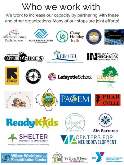 We often partner with Charlottesville Community Bikes at larger stops. Community Bikes repairs bikes, gives out free bikes and helmets, and educates families on biking.